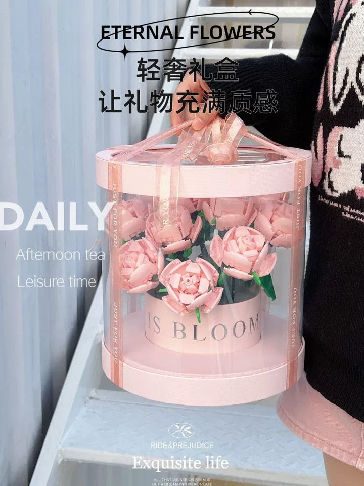 Block Building Romantic Elernal Flowers Bouquet Gift Box | Pink Red Blue White Rose - with LED Lights Valentine Wedding Gift DIY Handmade Gift